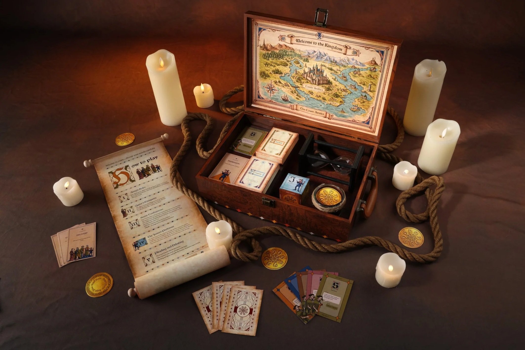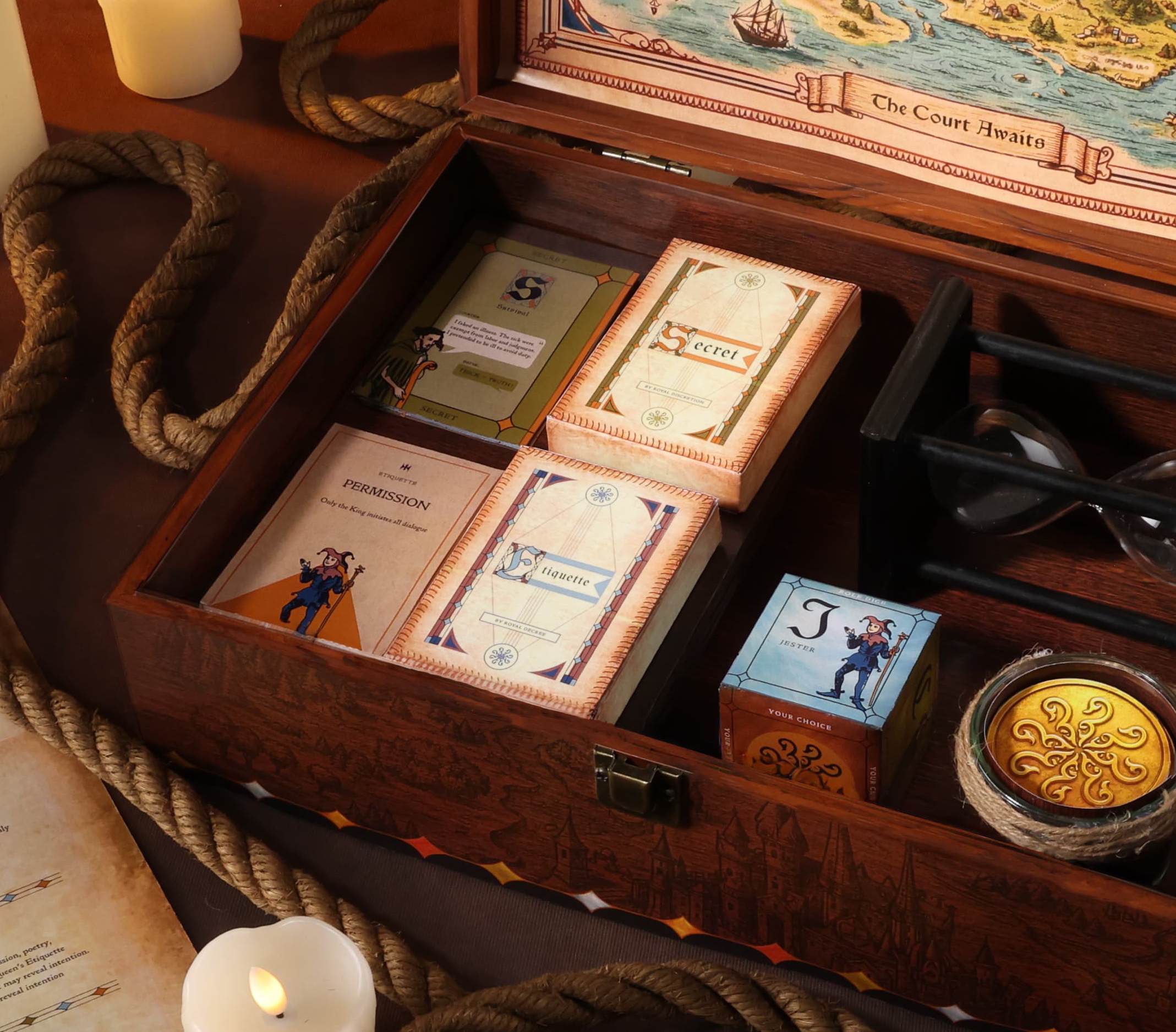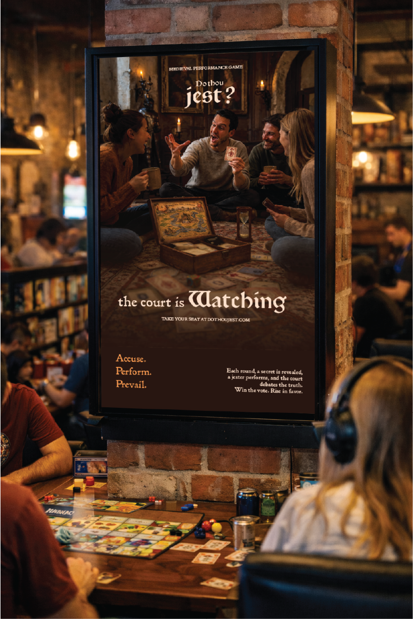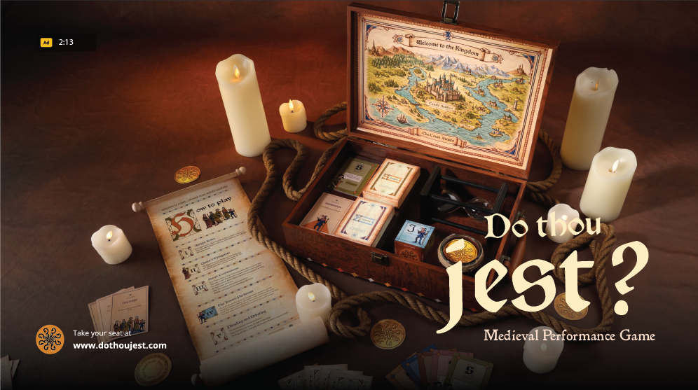 Do Thou Jest transforms game night into a lively, performance-driven experience inspired by medieval court entertainment. Drawing on humor, improvisation, and debate, players take on roles within a royal court where secrets are revealed, performed, and judged.