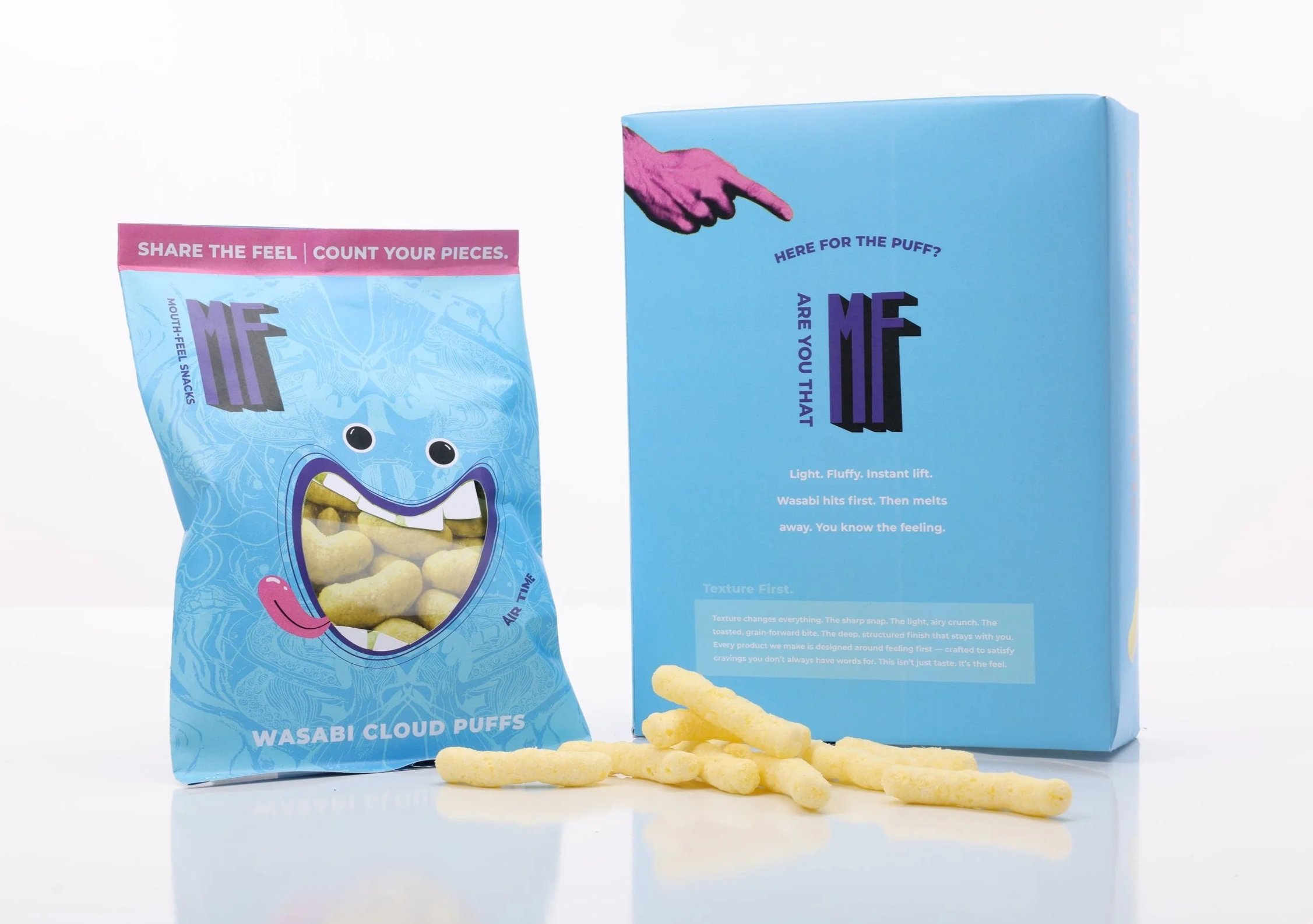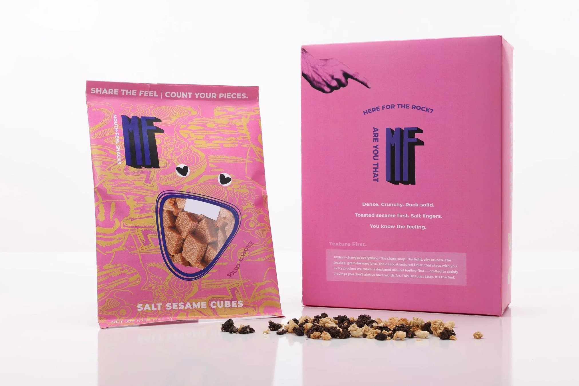 MF (Mouth-Feel) is a texture-first snack brand that designs products around the physical sensation of eating. By prioritizing mouth-feel over flavor alone, the brand reframes texture-driven cravings as valid sensory experiences—turning snack textures into a playful, expressive part of the eating experience.oes here