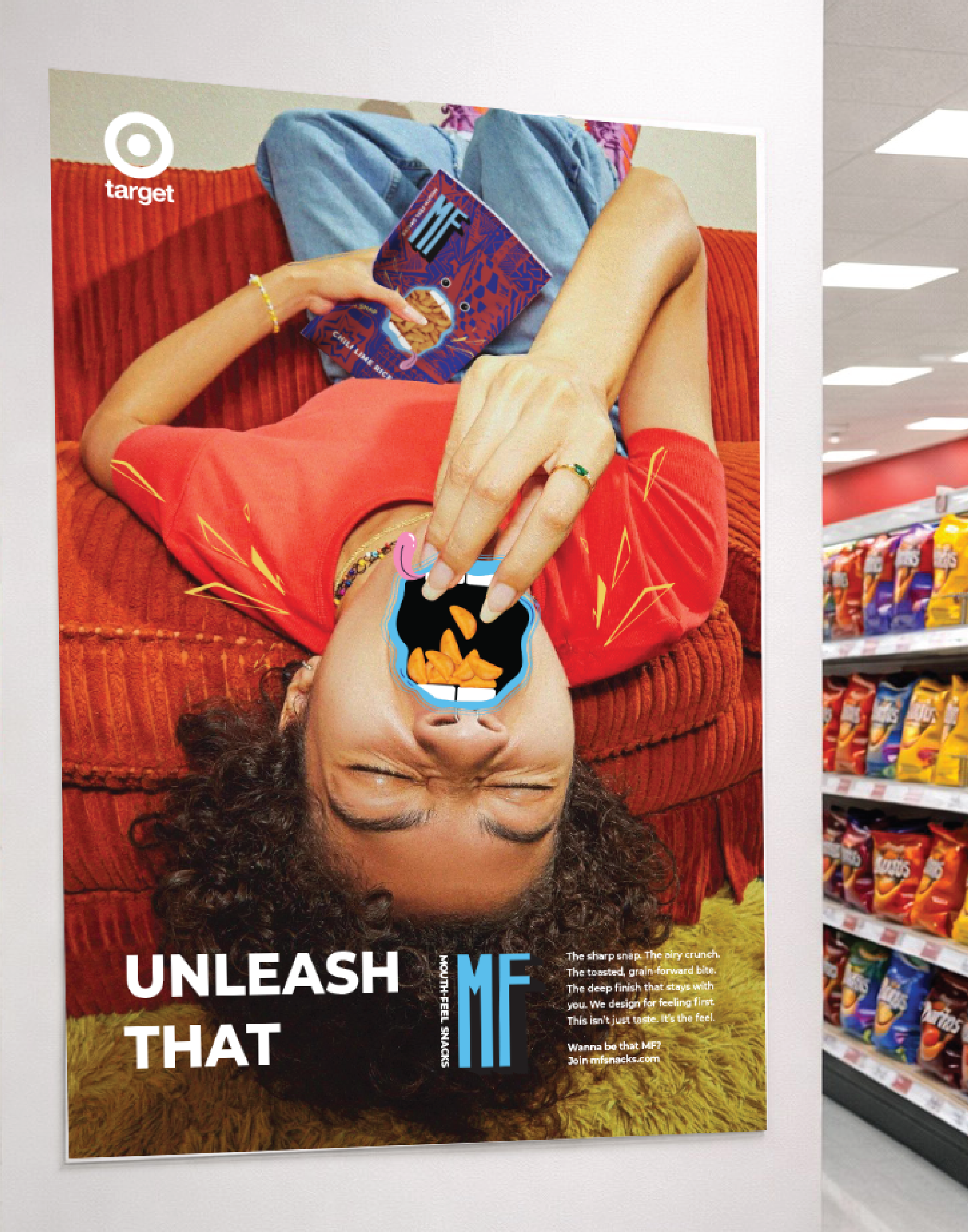 “Unleash that MF” is the campaign line for MF (Mouth-Feel), a texture-first snack brand that reframes cravings through sensation. It plays on both meanings of "MF"—mouthfeel and a bold, expressive attitude—positioning texture as something to be released and experienced actively.