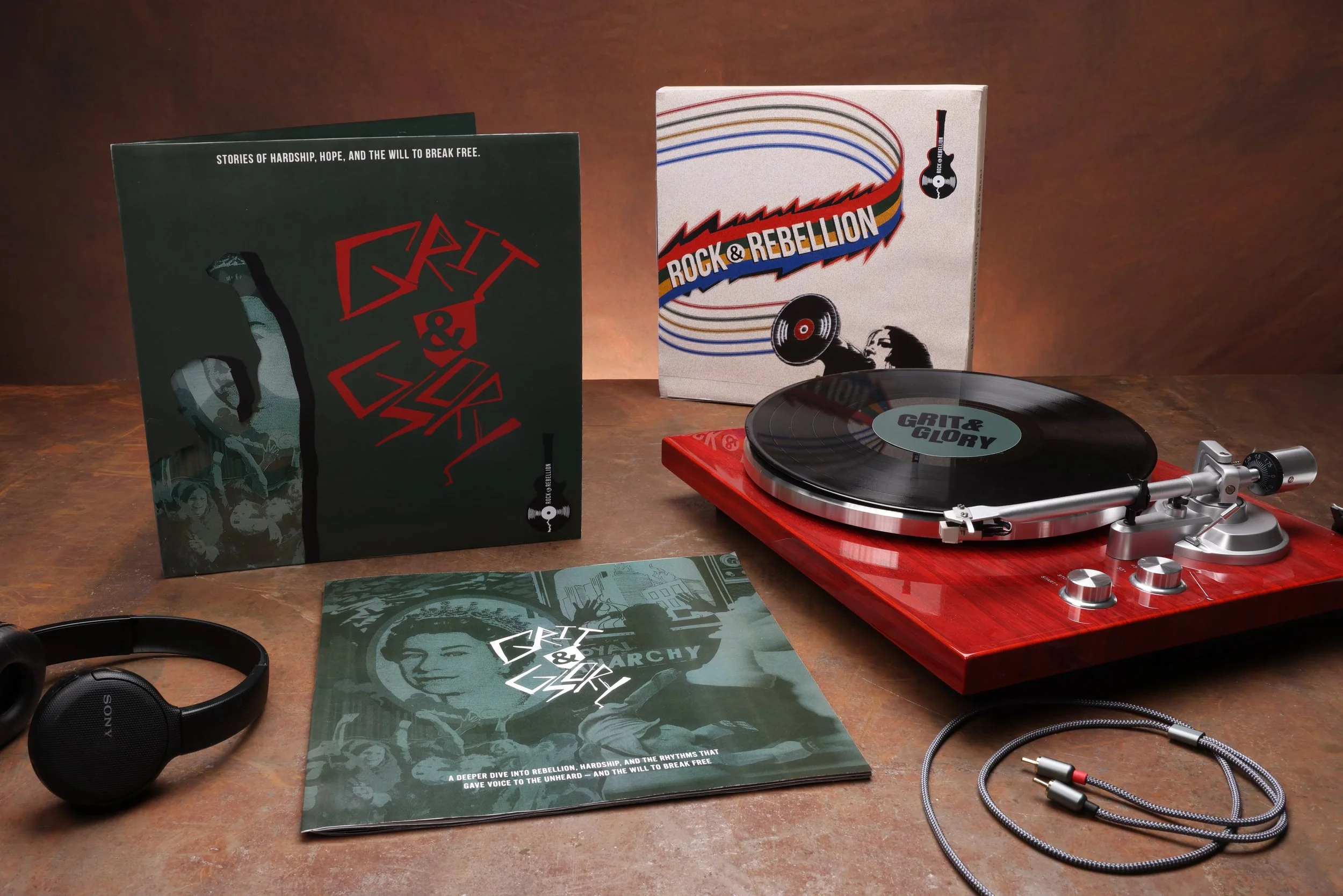 A curated vinyl collection of three records that traces a narrative of rebellion through music. Each record represents a different theme—class struggle, political dissent, and identity—supported by bold, symbolic design that mirrors the intensity and cultural impact of British rock.