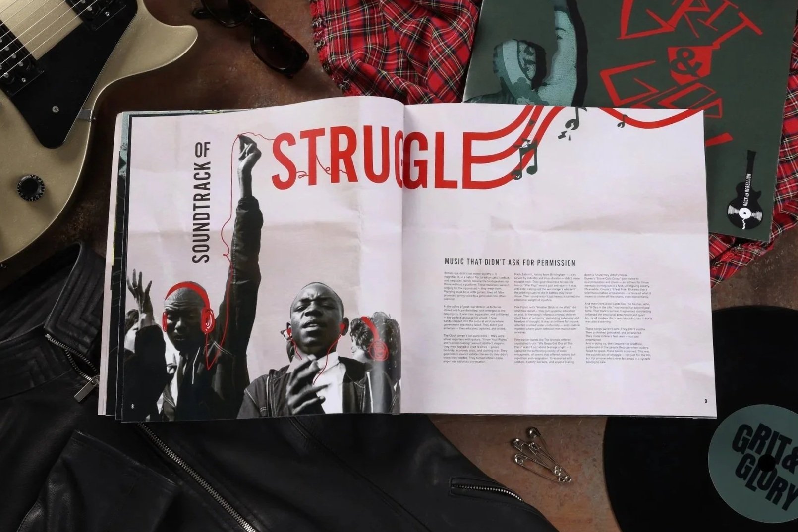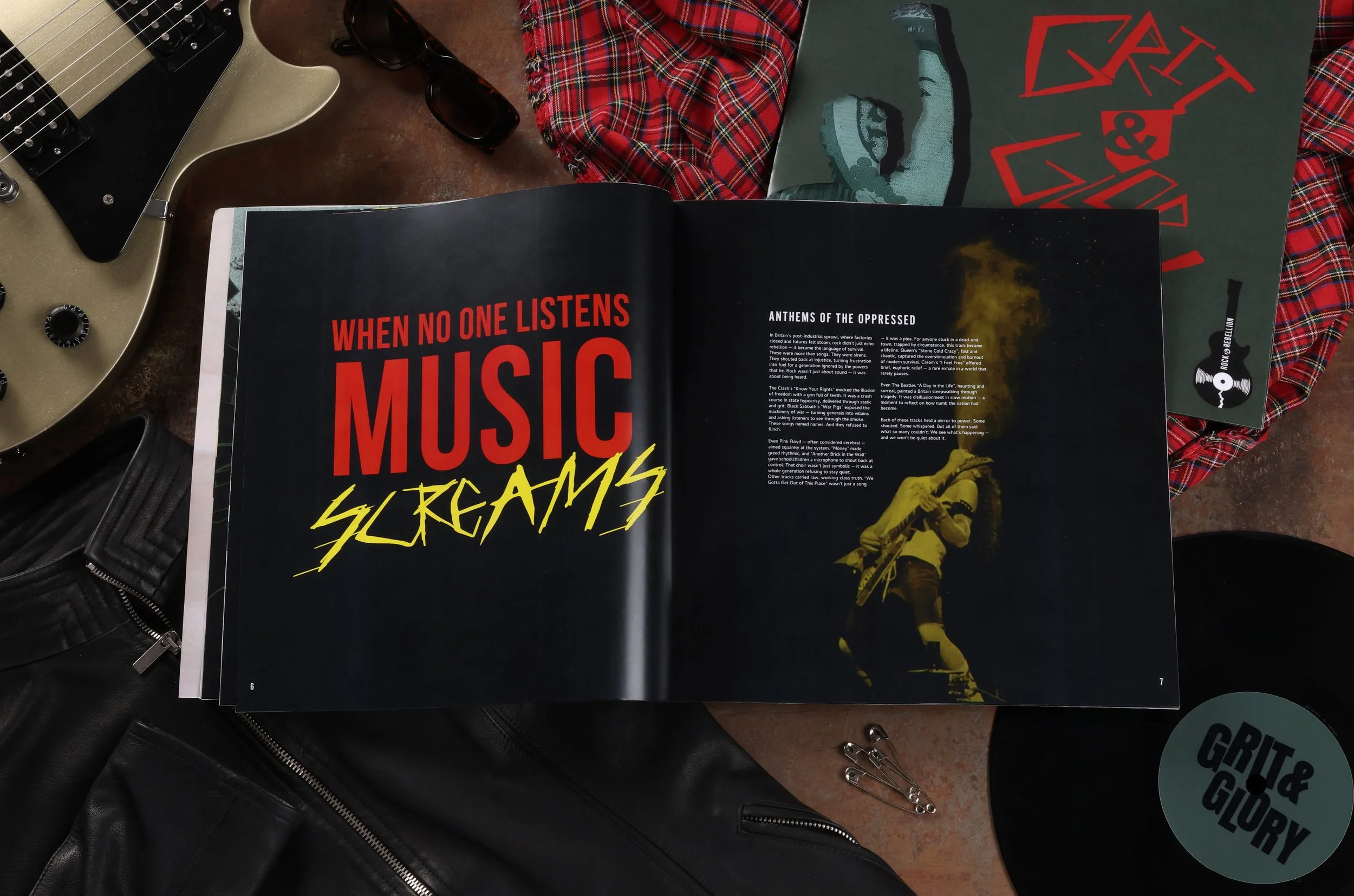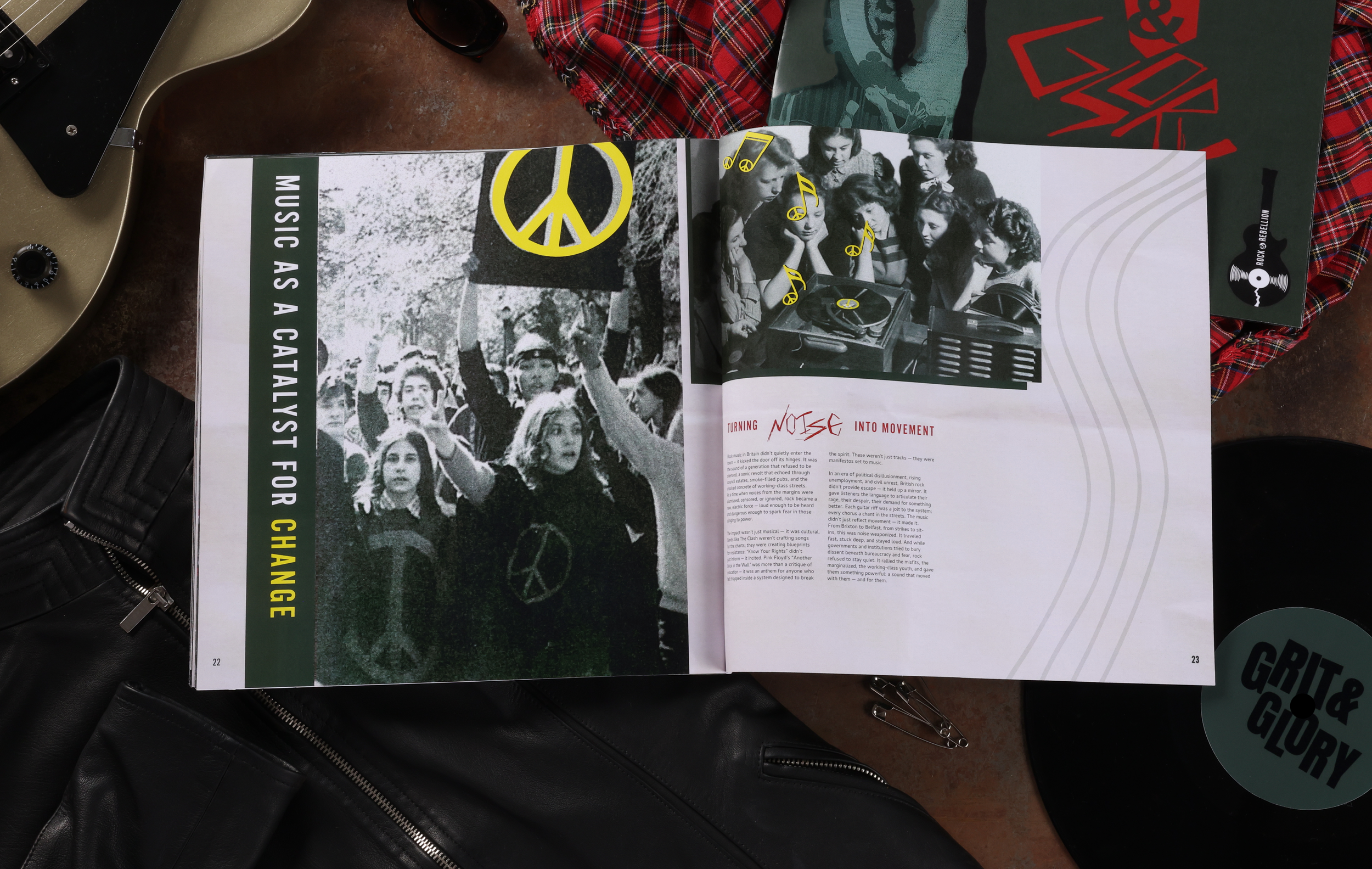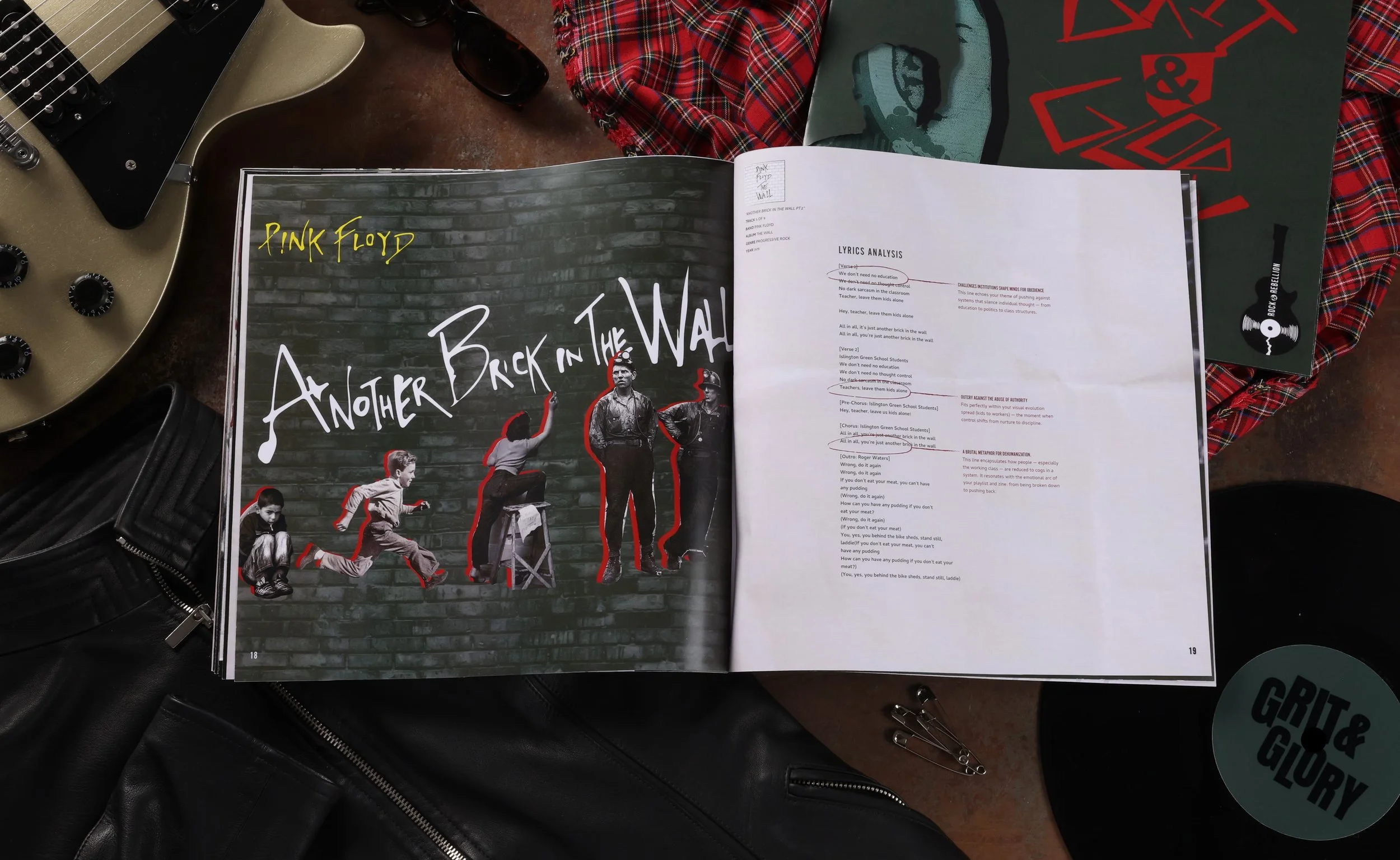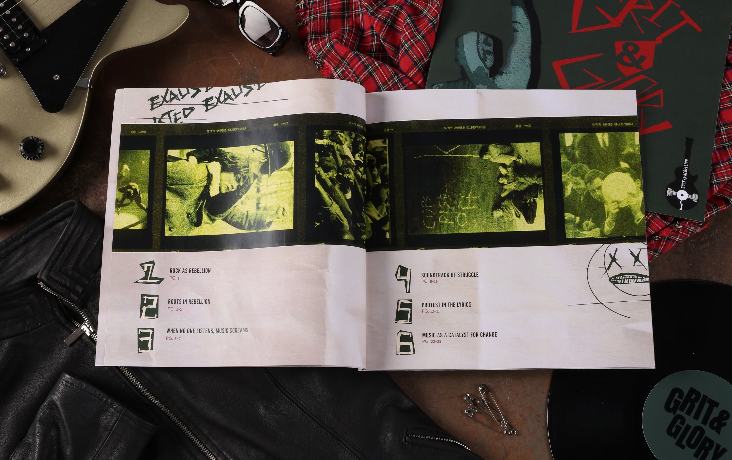 A 20-page editorial publication that combines song analysis, historical context, and expressive typography to visually amplify the themes of rebellion and protest embedded in the music.
